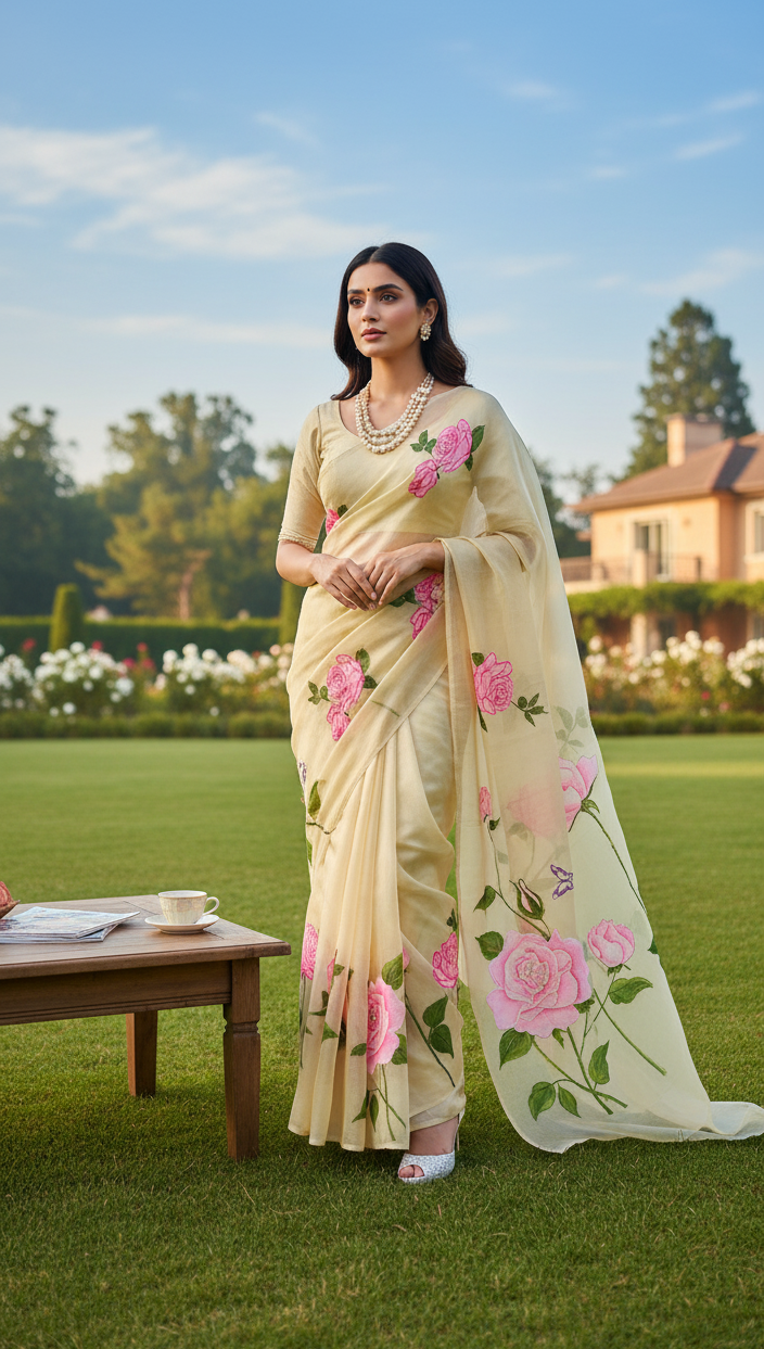 A Pastel yellow organza adorned with handpainted 3D roses that bloom along the pallu and beautiful pink roses on the pleats