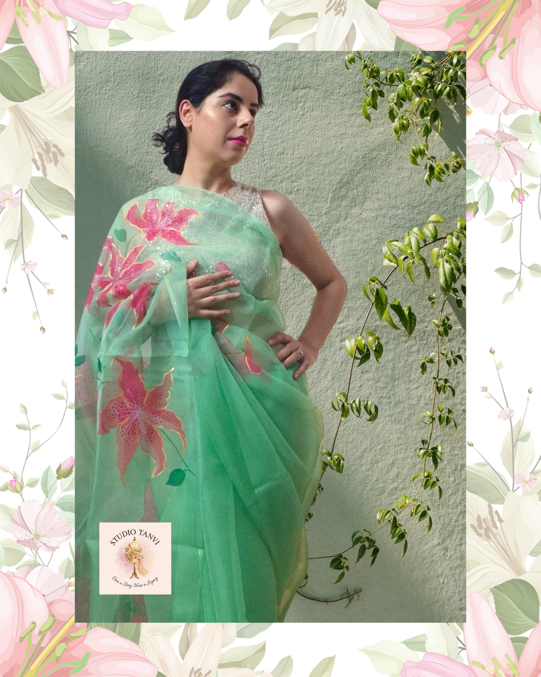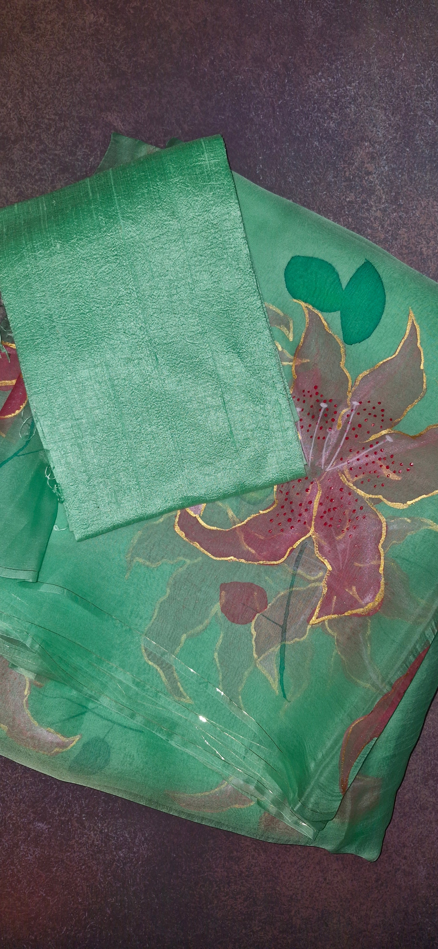 Introducing Pastel Green Elegance - a pure silk organza (20 grams) in a stunning pastel green shade adorned with majestic magenta tiger lilies. This luxurious fabric comes with a matching raw silk blouse piece, perfect for creating an elegant and sophisticated look. Elevate your style with this exclusive piece.