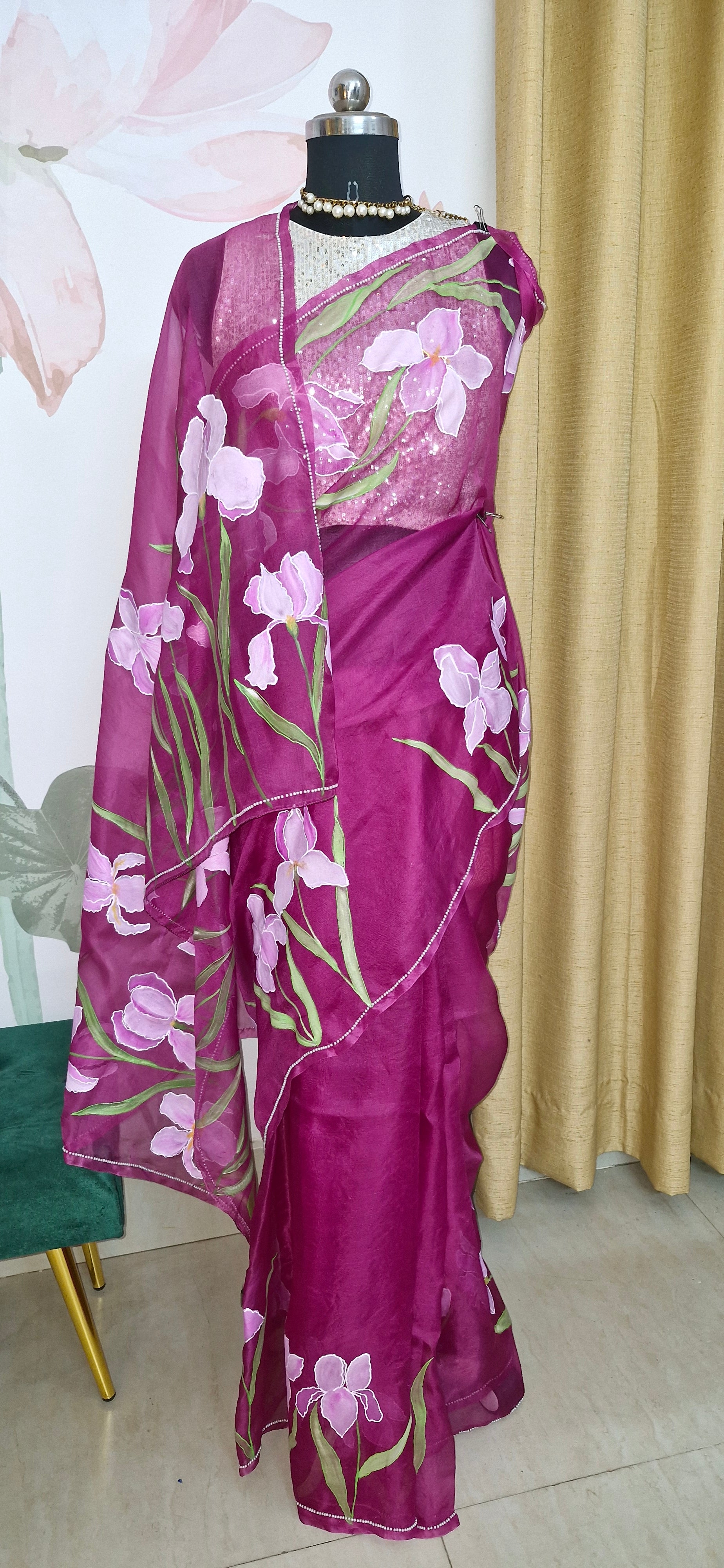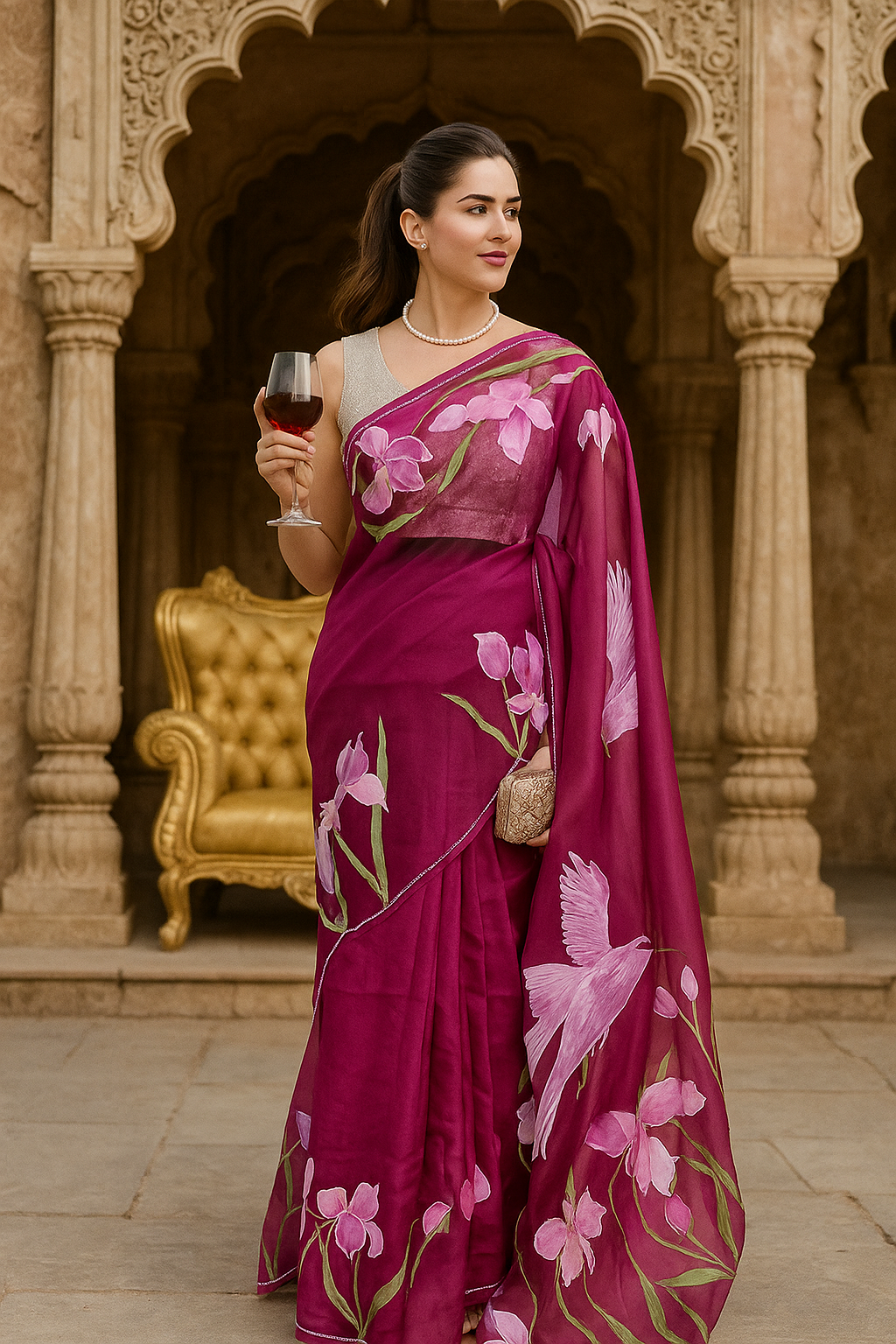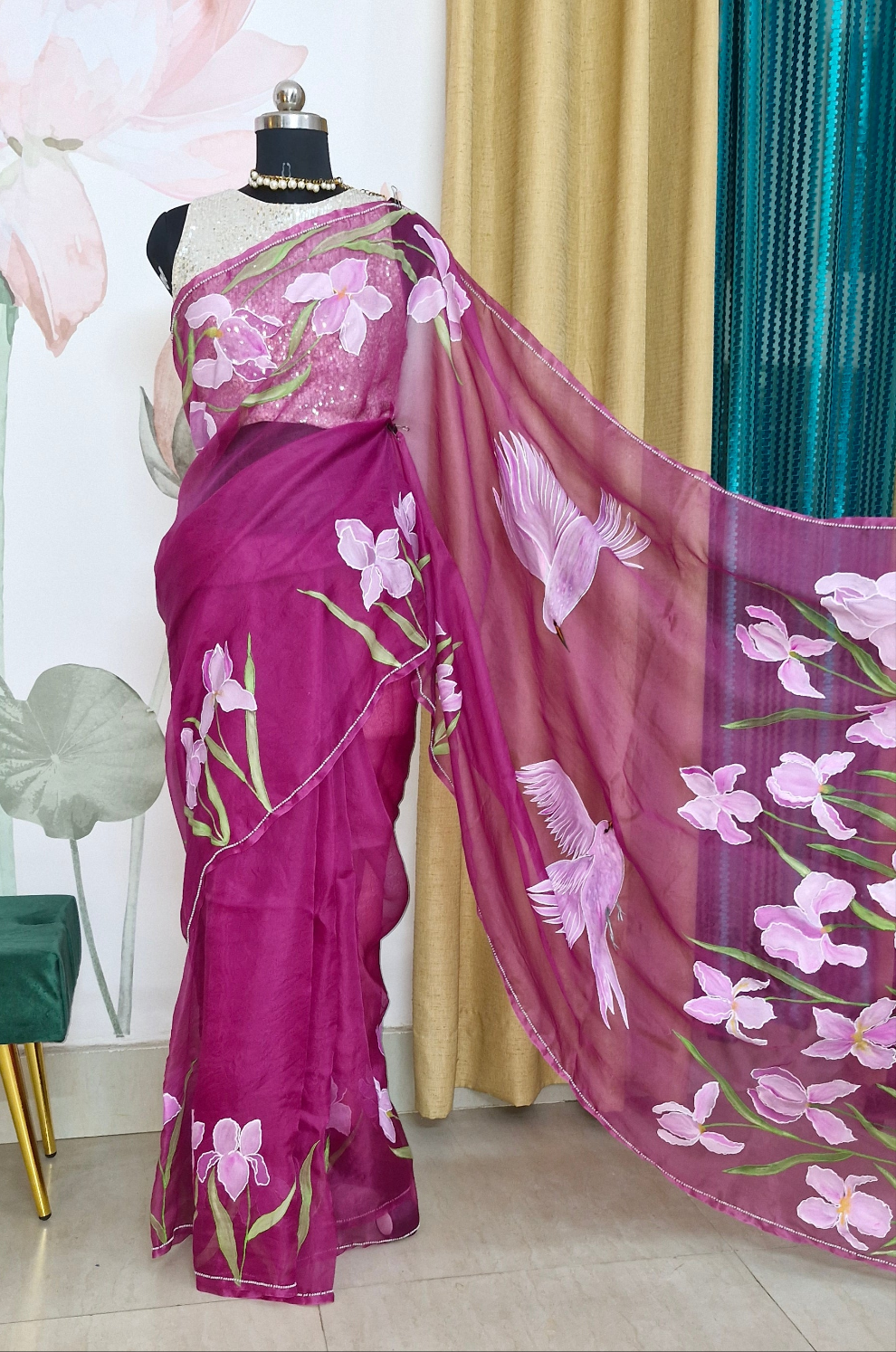 Draped in wine-hued pure organza, this saree is elegance in motion. Pearls delicately trace the border, while hand-painted irises bloom across the fabric. Look closer—two graceful birds flutter through the flower field, turning this six yards into a living canvas of art and luxury.